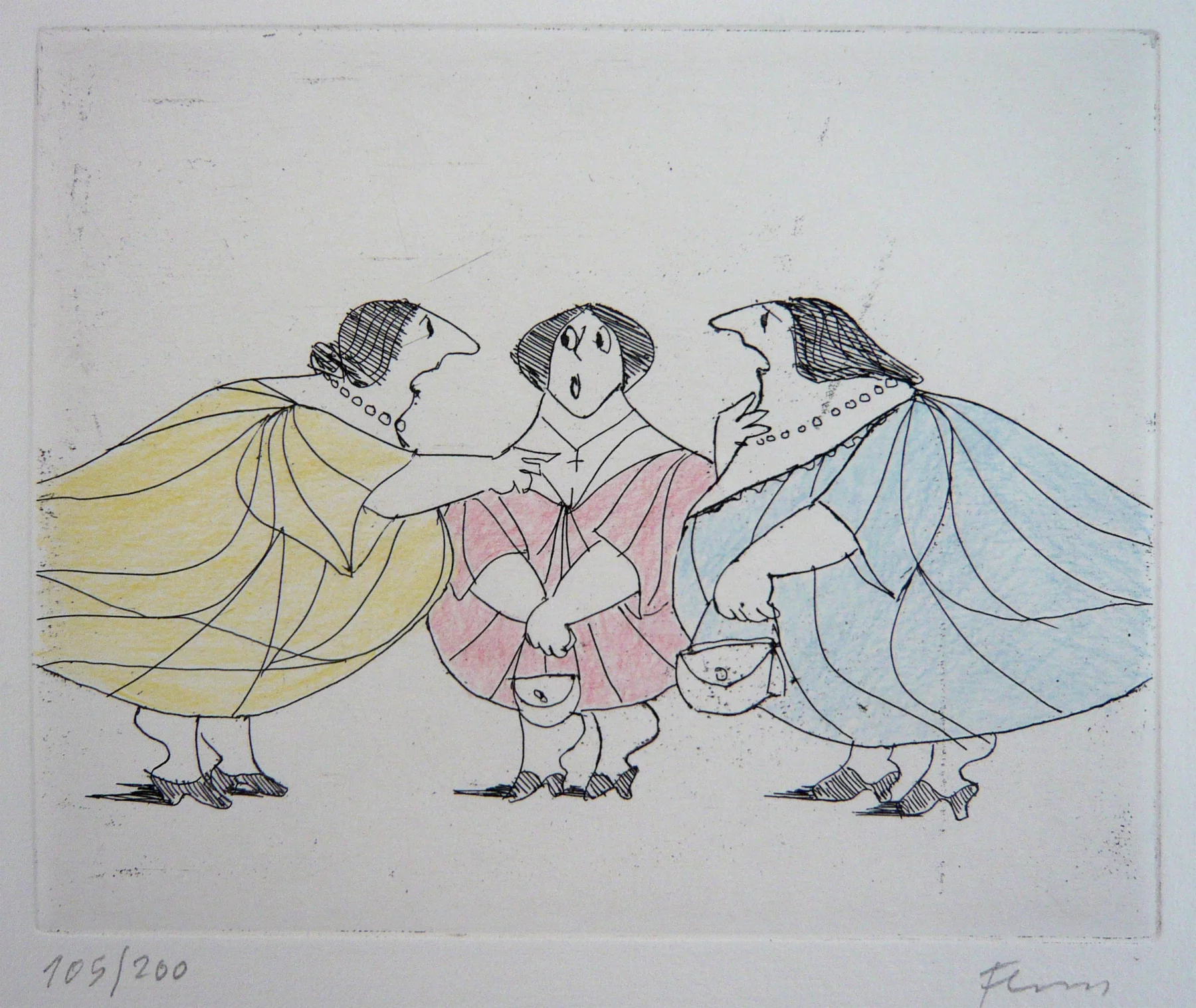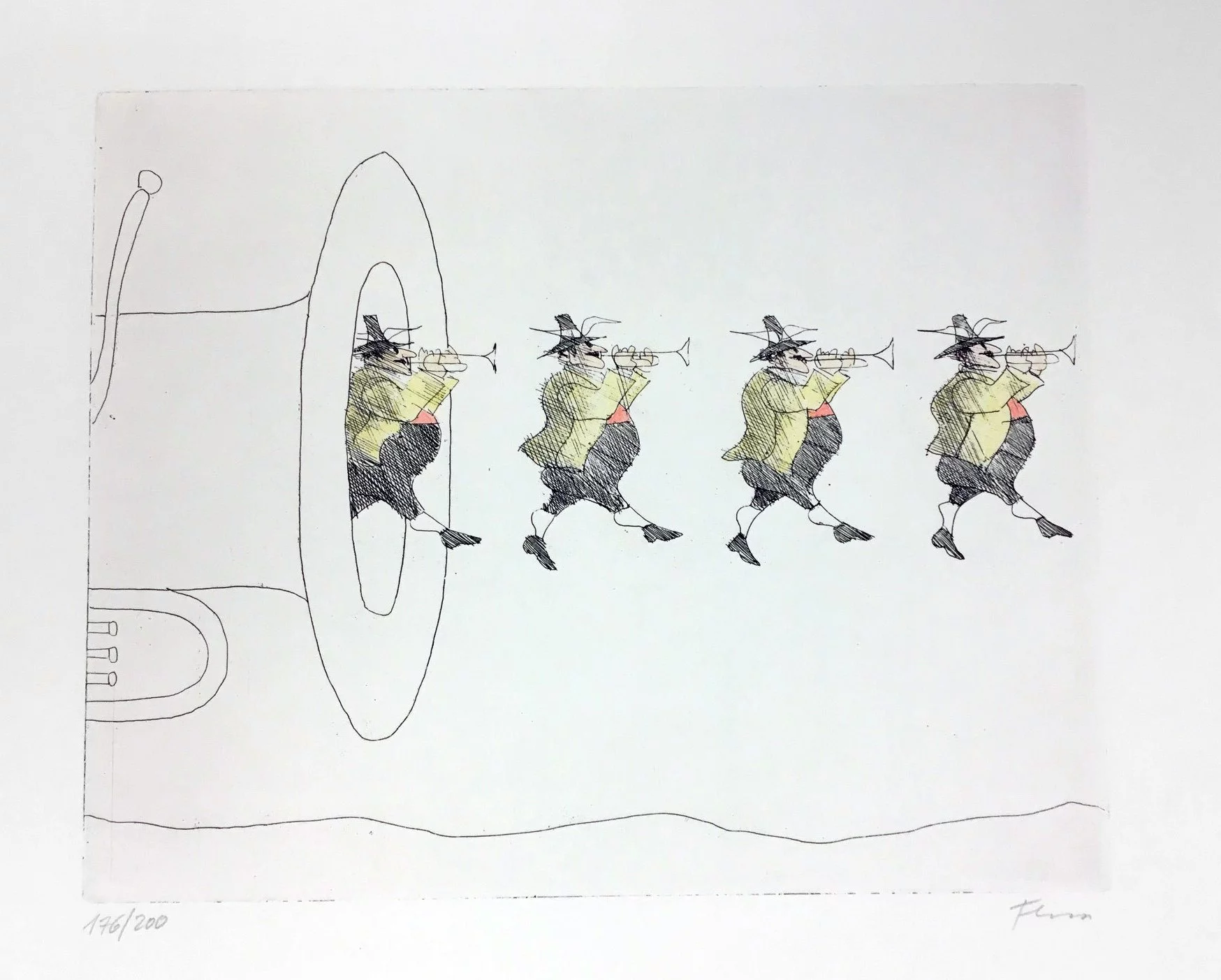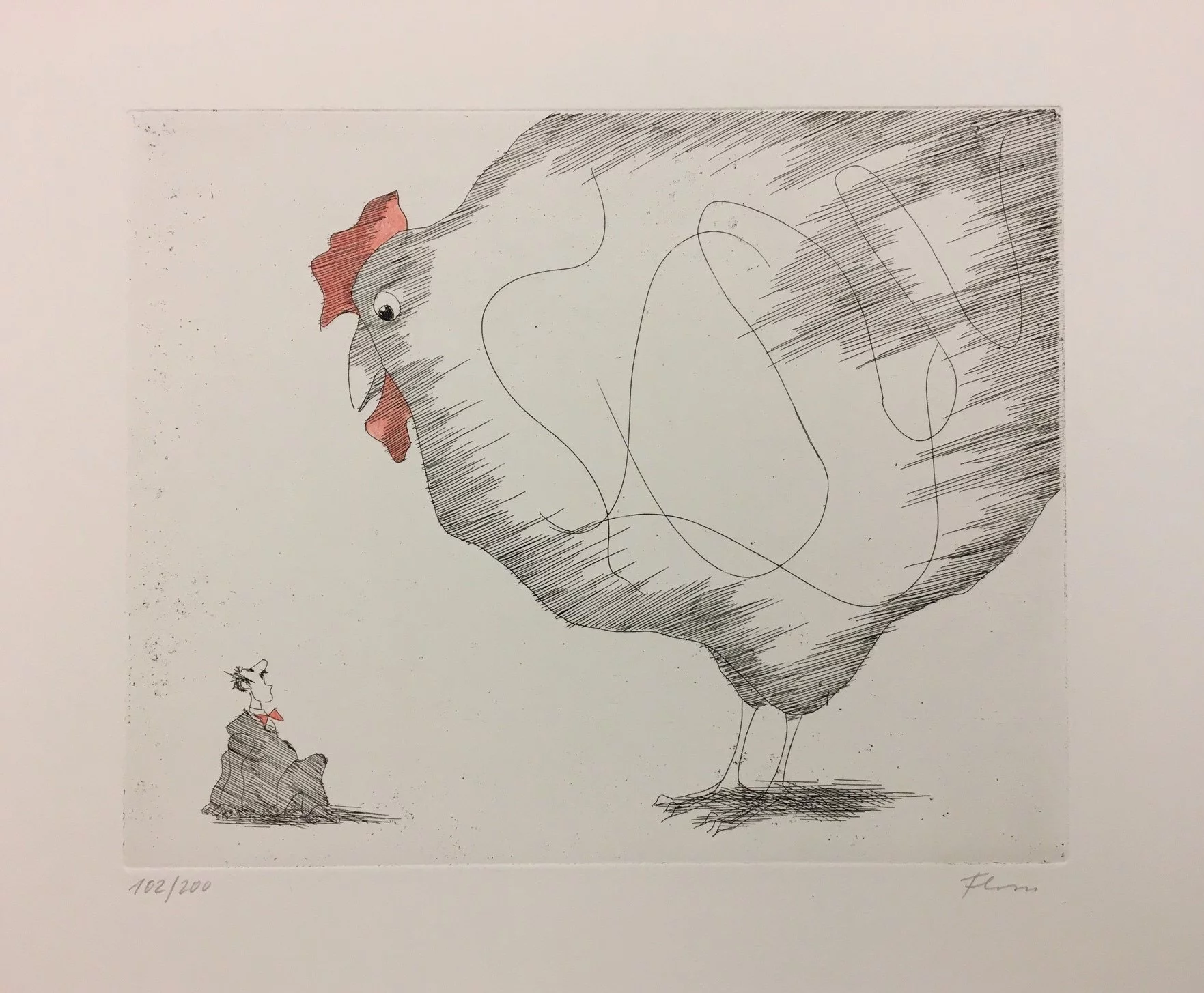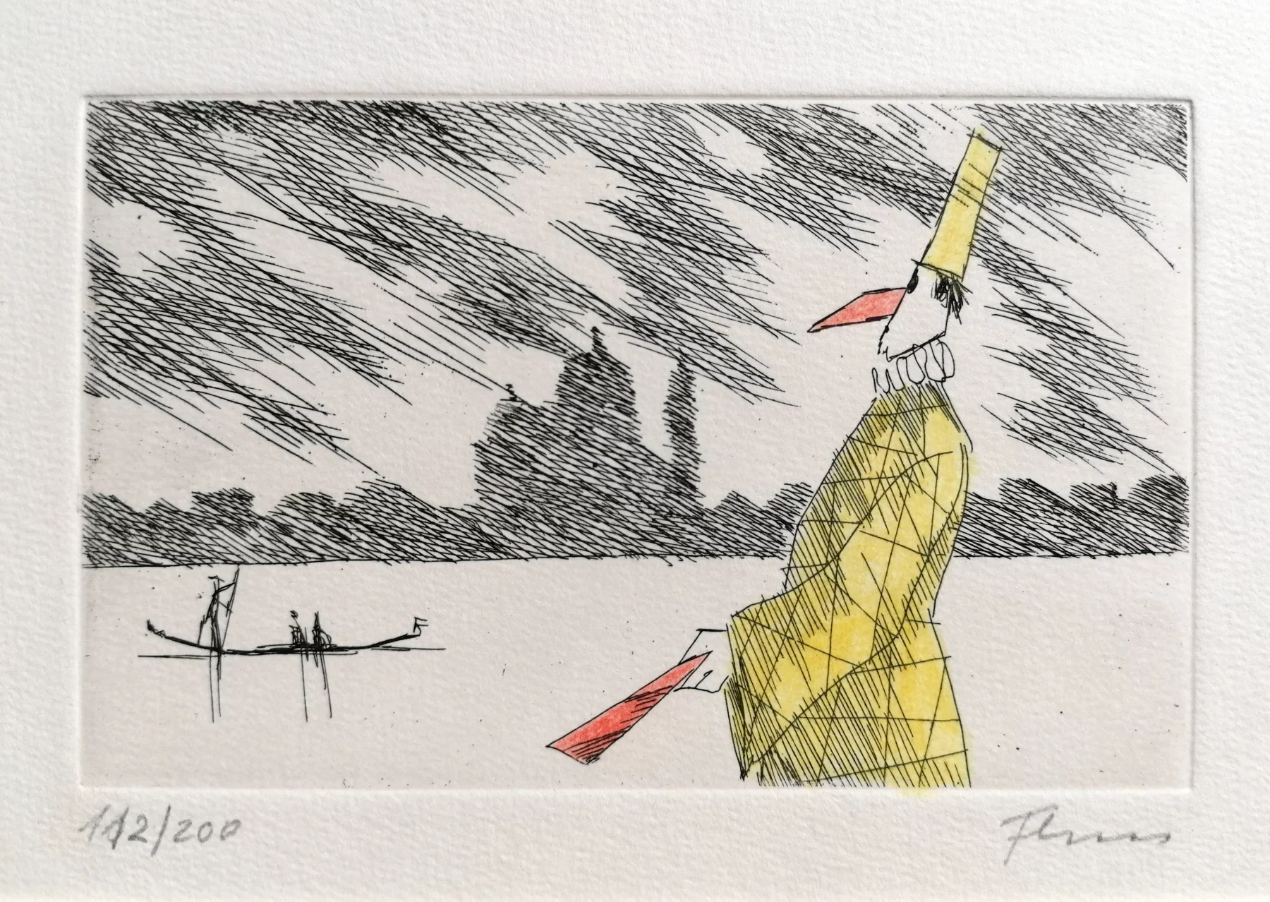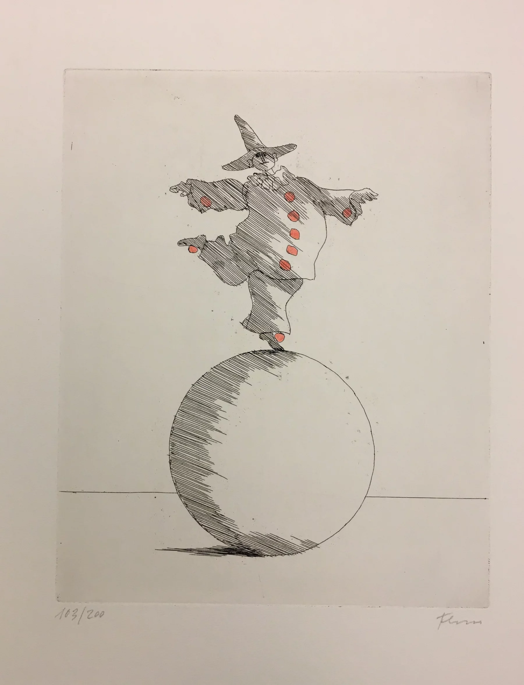 Other frequent motifs include such atmospheric backdrops as the lagoons and carnivals of Venice. Acrobats fascinated him throughout his life. His talent was discovered and encouraged from an early age. His drawing master introduced him to the renowned portrait painter Max von Esterle. His subsequent studies at the Academy of Fine Arts in Berlin* were rudely interrupted in 1944 when he was conscripted to serve in the Wehrmacht. Following the war, the artist became close friends with the graphic artist Alfred Kubin, who became a strong influence on his work. Flora held the first of his many solo exhibitions in Bern as early as 1945. In 1948 he joined the Wiener Art Club. He started drawing cartoons for newspapers including the Neue Zeitung, Die Zeit and The Times literary supplement, and as a book illustrator for publishers including Diogenes in Zürich. He also designed postage stamps and stage sets. He became a member of the P.E.N. club in Liechtenstein in 1999, and served as its president from 2003-2006. Many major galleries and museums have works by Flora in their collections. Erich Kästner described him as a ‘writer of images’, while Friedrich Dürrenmatt called him the ‘thinker and brooder of the caricaturists’.