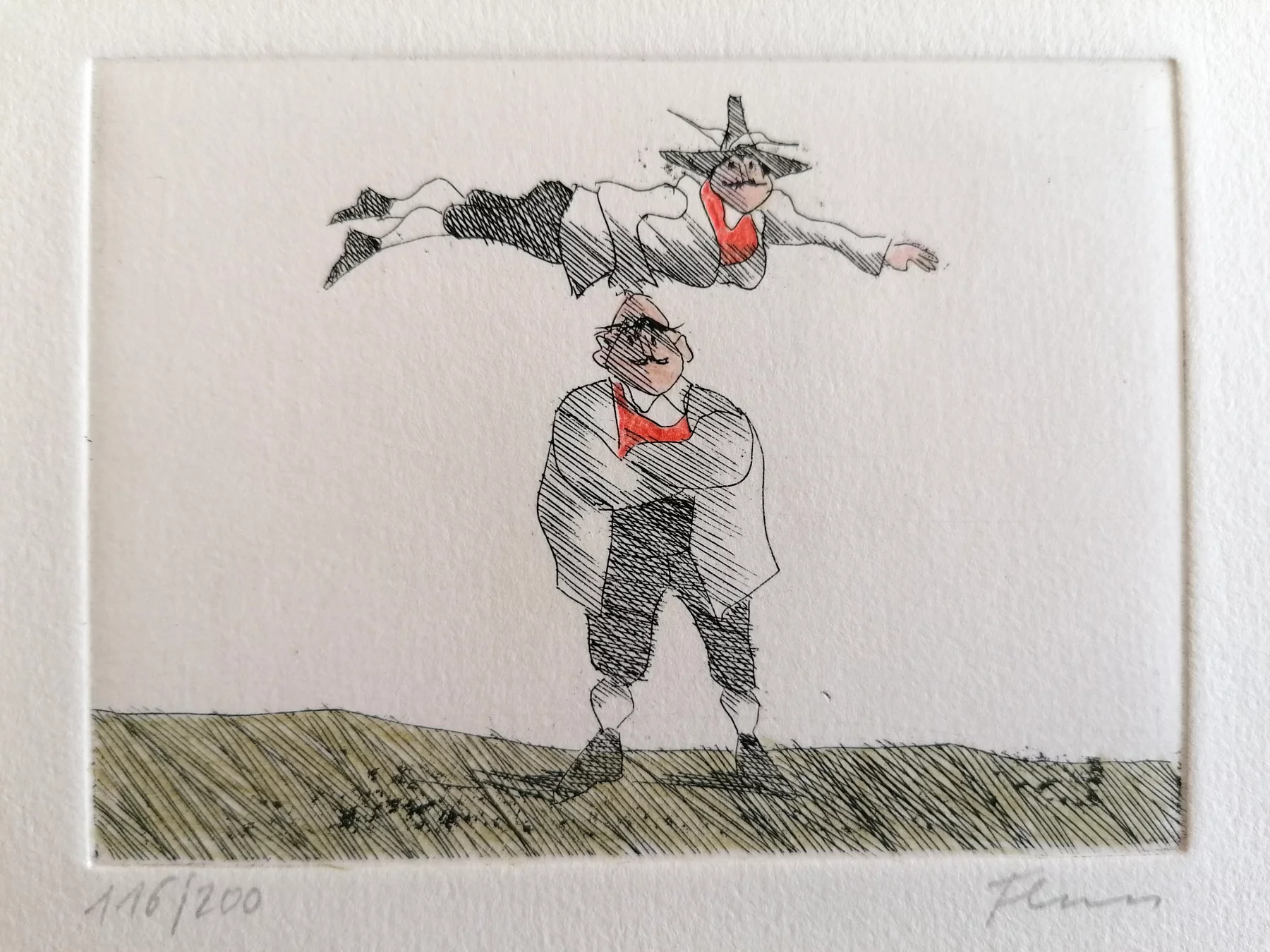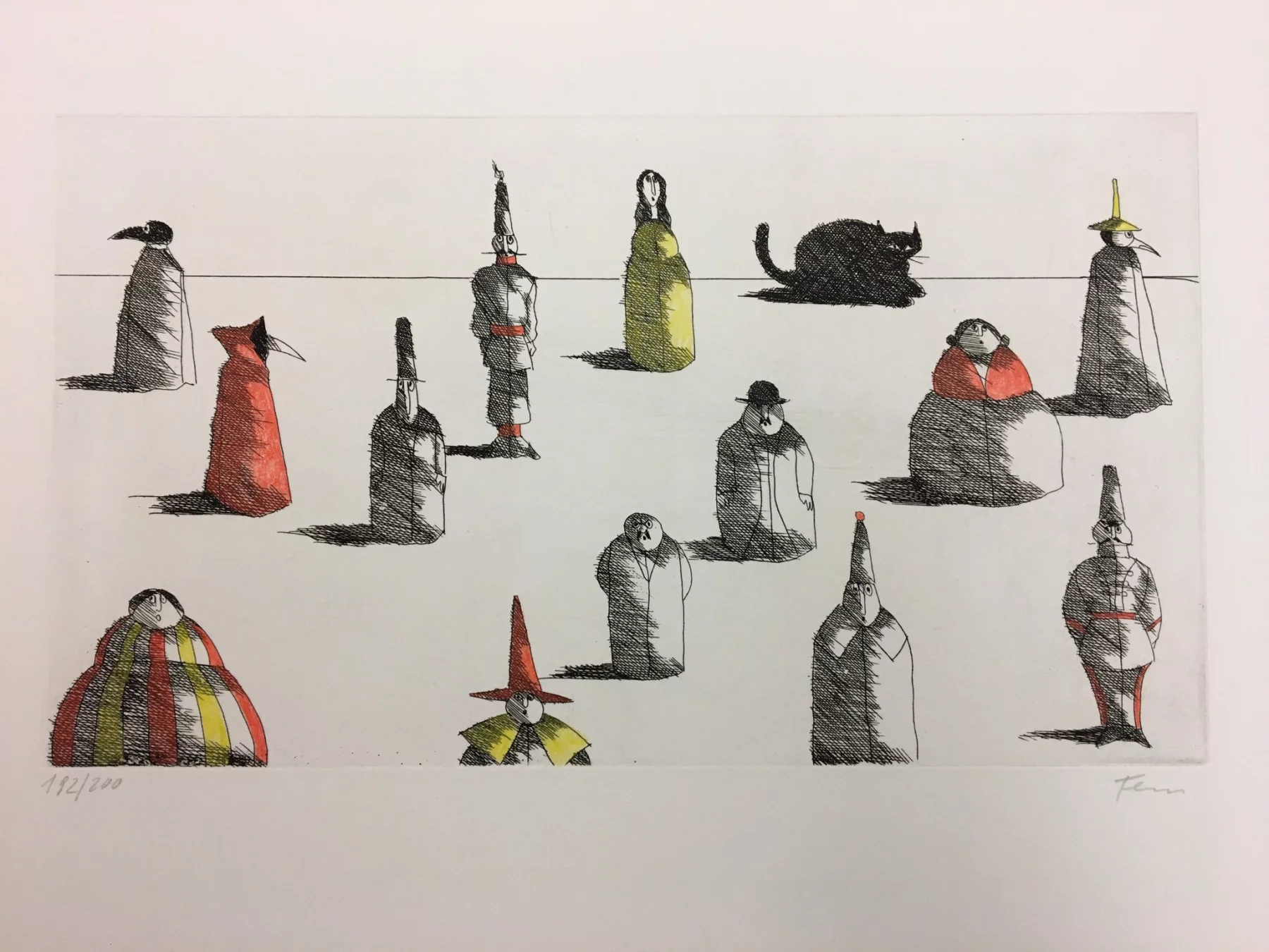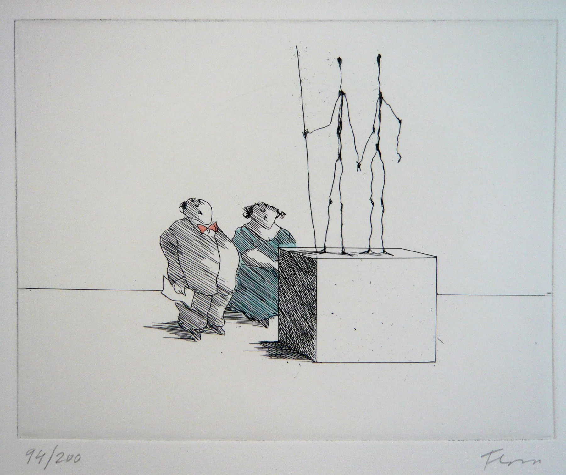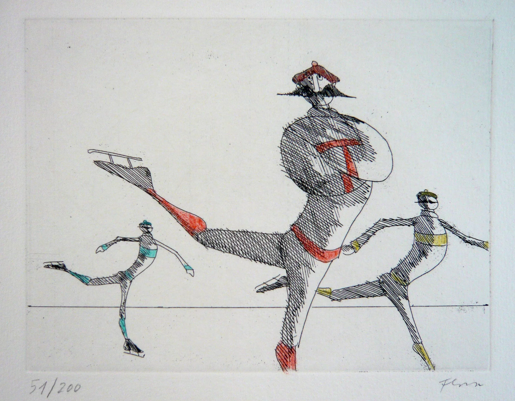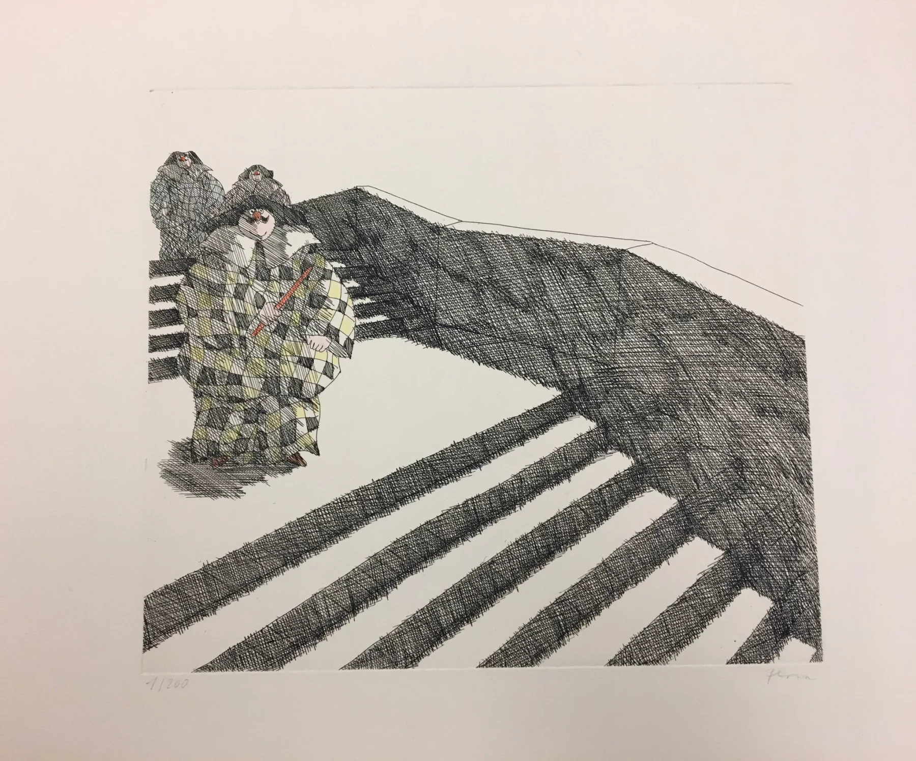 Other frequent motifs include such atmospheric backdrops as the lagoons and carnivals of Venice. Acrobats fascinated him throughout his life. His talent was discovered and encouraged from an early age. His drawing master introduced him to the renowned portrait painter Max von Esterle. His subsequent studies at the Academy of Fine Arts in Berlin* were rudely interrupted in 1944 when he was conscripted to serve in the Wehrmacht. Following the war, the artist became close friends with the graphic artist Alfred Kubin, who became a strong influence on his work. Flora held the first of his many solo exhibitions in Bern as early as 1945. In 1948 he joined the Wiener Art Club. He started drawing cartoons for newspapers including the Neue Zeitung, Die Zeit and The Times literary supplement, and as a book illustrator for publishers including Diogenes in Zürich. He also designed postage stamps and stage sets. He became a member of the P.E.N. club in Liechtenstein in 1999, and served as its president from 2003-2006. Many major galleries and museums have works by Flora in their collections. Erich Kästner described him as a ‘writer of images’, while Friedrich Dürrenmatt called him the ‘thinker and brooder of the caricaturists’.
