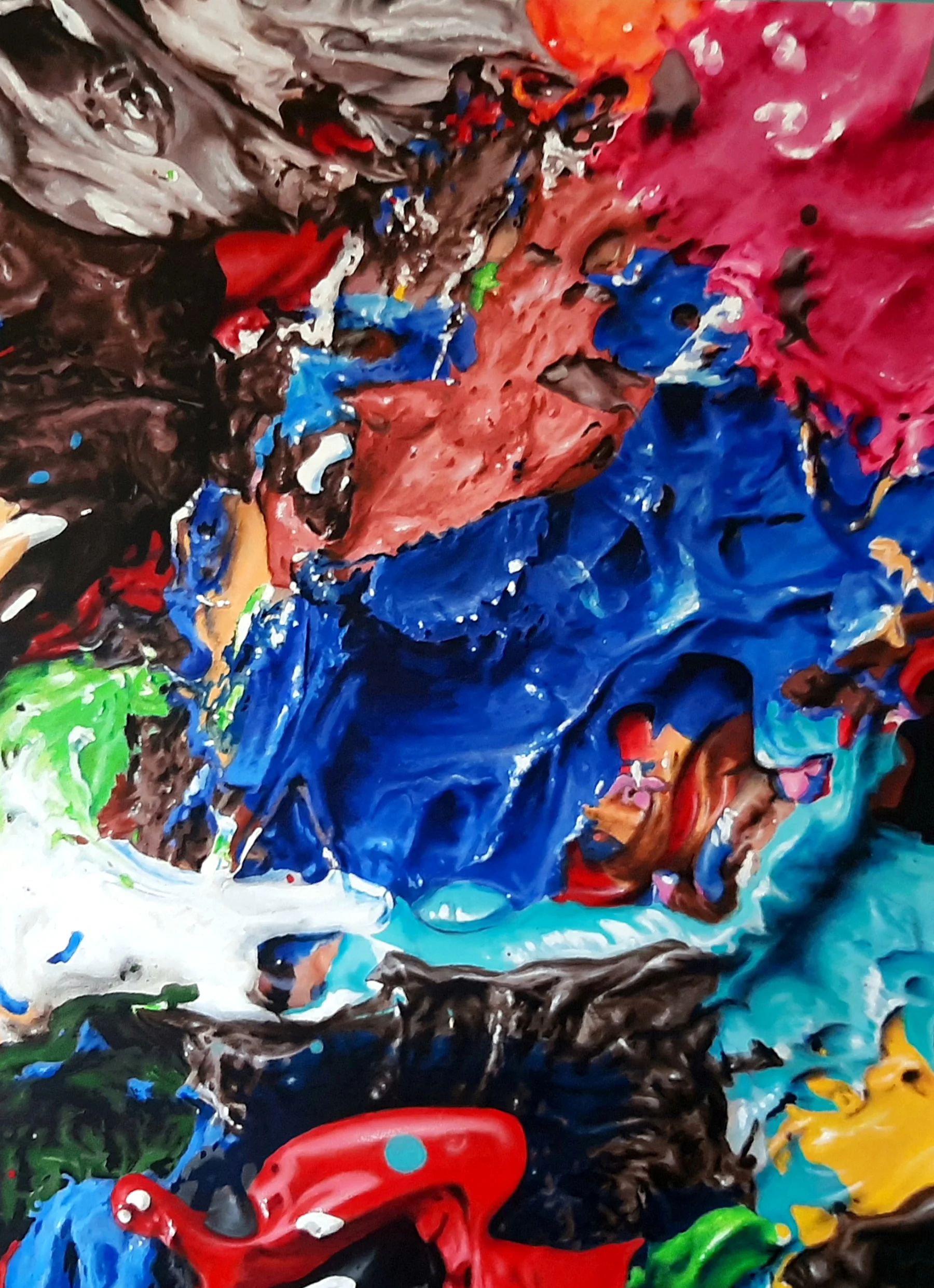 The Palettes are surfaces where color both explodes and settles, representing vital residues of a daily practice that carries the full density of the pictorial process. Each palette keeps the memory of gesture and time of the artwork, absorbing shades that no longer belong to a finished painting, documenting its material shadow and its condition of possibility. These are traces, marks, energetic fields from which color becomes an autonomous subject, freed from the need of representation.